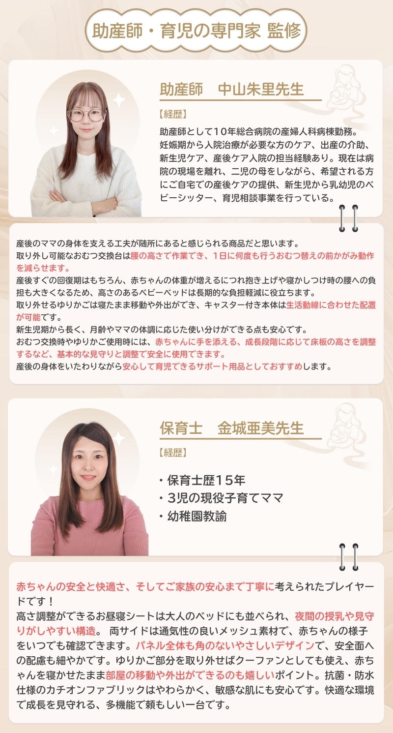 | 商品特徴 | 【4WAY仕様 】 新生児から幼児期まで長く使える多機能デザイン ・新生児期:ベッドやゆりかごとして安心して眠れる ・乳児期:おむつ交換台としてママ・パパの腰への負担を軽減 ・幼児期:安全なプレイヤード(ベビーサークル)として遊べる 【折りたたみ式で省スペース】 コンパクトに収納でき、移動や持ち運びも簡単。旅行や帰省にも便利です 【簡単組立】 工具不要で誰でもスムーズに設置可能。毎日の使用にストレスがありません 【安心の安全規格適合】 赤ちゃんがぐっすり眠れるように、やさしく包み込む形状で、ママのおなかの中のような安心感を再現。 【しっかりした耐久性】 ・静荷重:約60kg ・動荷重:約20kg 鉄管フレームと丈夫なカチオンファブリック&オックス生地で長く安心して使えます 【おむつ交換台付き】 赤ちゃんのお世話がしやすく、パパ・ママの負担を軽減します 【添い寝対応き】 赤ちゃんとご家族の距離を近く感じられ、安心してお使いいただけます |