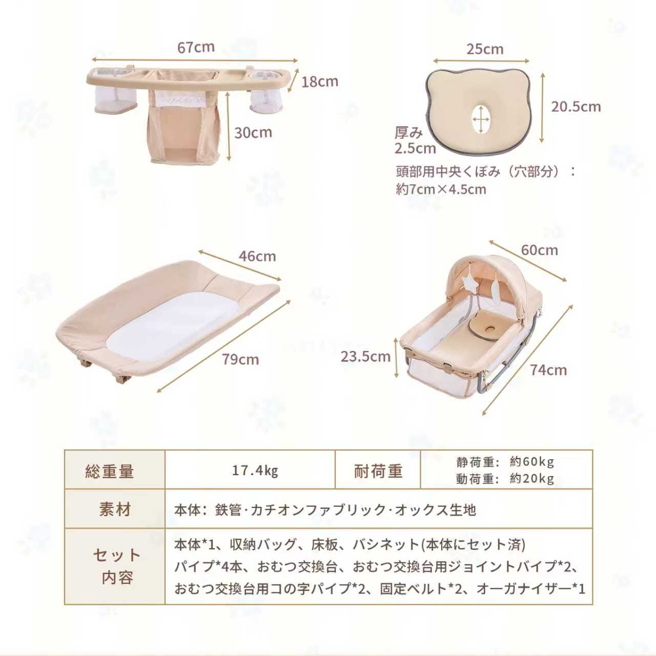 | セット内容 | 本体×1、収納バッグ、床板、バシネット(本体にセット済)、パイプ×4本、おむつ交換台、おむつ交換台用ジョイントバイプ×2、おむつ交換台用コの字パイプ×2、固定ベルト×2、オ一ガナイザ一×1 |