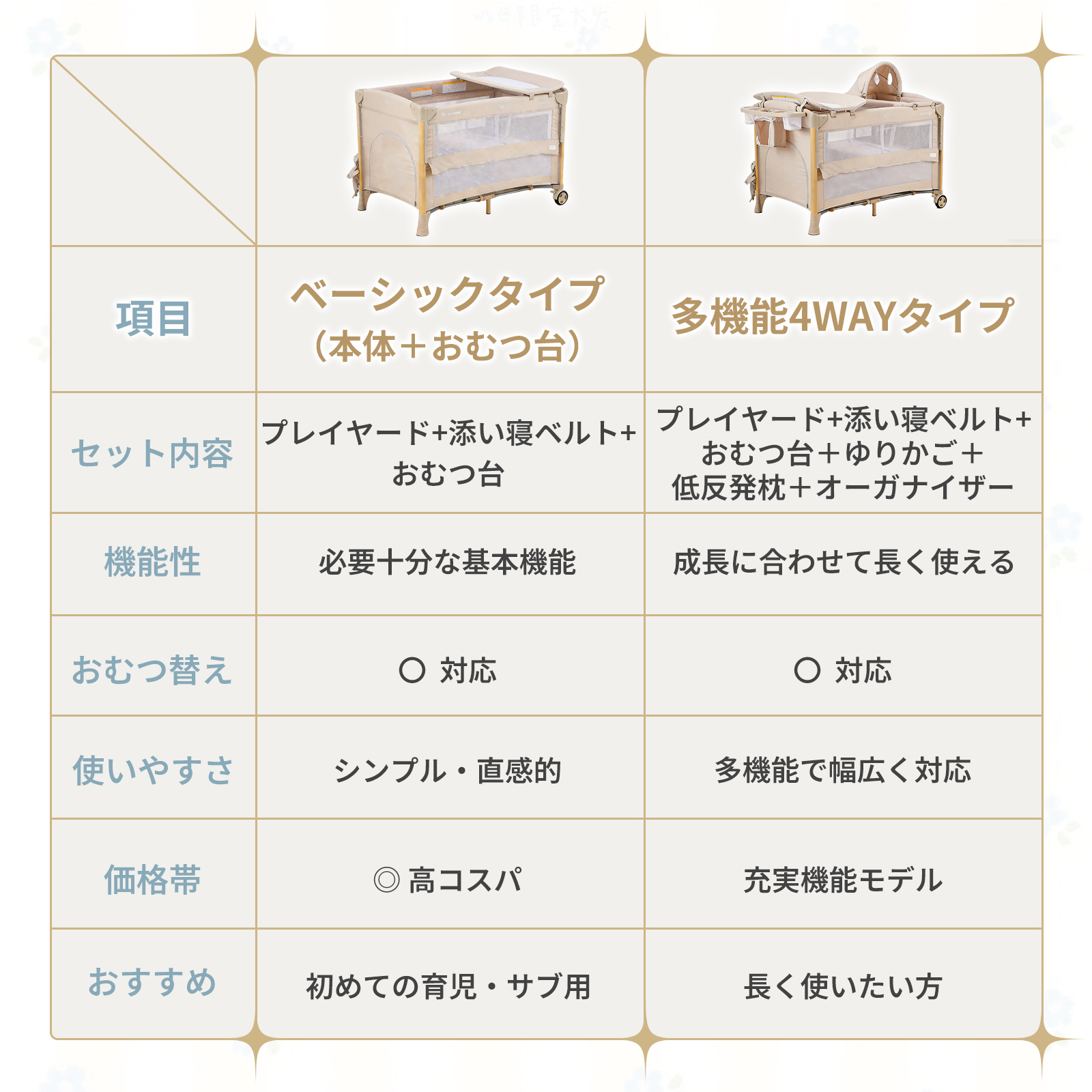 | こんな方におすすめ | ・赤ちゃんの寝床と遊び場を1台にまとめたい方 ・省スペースで使える折りたたみベッドを探している方 ・安全性・耐久性のしっかりしたベビー用品をお求めの方 ・出産祝いのプレゼントを検討している方 赤ちゃんとご家族の毎日に寄り添う、多機能プレイヤード。 これ1台で「寝る・替える・遊ぶ・ゆらす」が叶います。 安心安全な設計で、快適な子育てライフをサポートします。 |