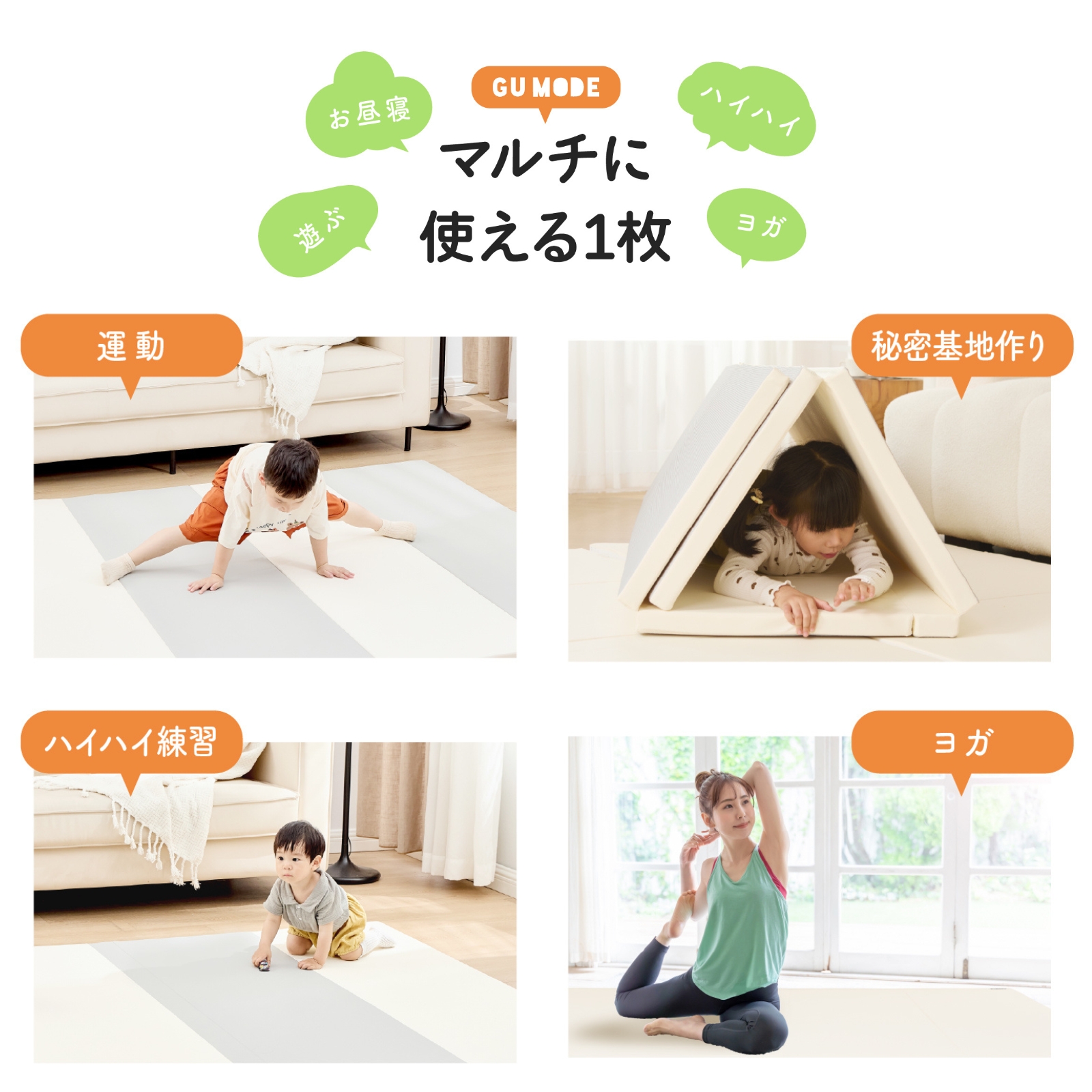 GU MODE ベビーサークル 置くだけ ベビーゲート ベビーフェンス 実用新案登録 ドアロック付き | GU MODE プレイマット シームレス 折りたたみ 厚み3cm 防水 防音 収納便利 | GU MODE リバーシブルマット シームレス 高密度XPE素材 両面使用 床暖房対応 厚さ2cm |