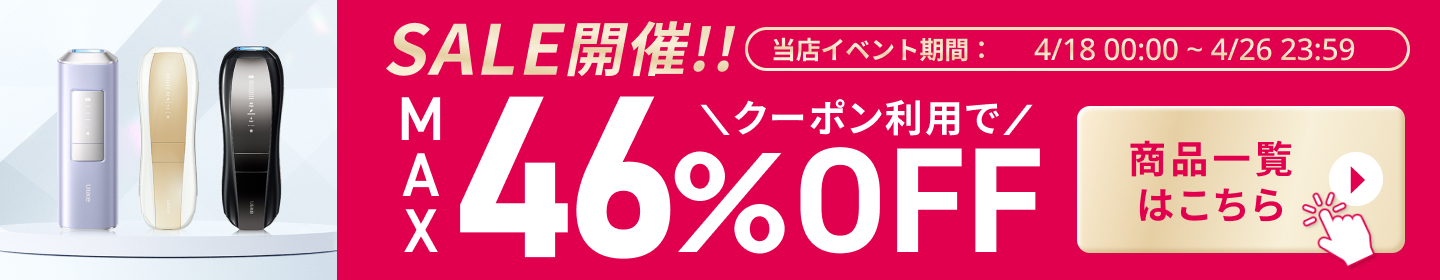 | 【最新サロン級IPL光脱毛器】 前モデル(Air3)から大幅にアップデートをしたAir10。 たった2回で効果を実感することが可能に。 当社最高峰のパワーと最新の冷却機能で、痛みを抑えて効果を実感できます。 【最大出力26J×ダブルランプ技術で効果倍増!】 前モデル(Air3)と比べ、エネルギー出力が26Jとパワーアップ! さらに新搭載のダブルランプ技術で大幅に機能が向上しました。 ・出力面積が18%増加 ・1回の照射でより強いパワー、より広範囲、より深くまで届くように。 ・照射はより均一に ・パルス幅変調技術で効率的かつ皮膚のやけど防止 【特許取得!冷感クールリング機能・痛みレス*】 ハイパワーなのに使用前後に一切保冷剤を使う必要ナシ!手間がかからないから続けられます。 特許を取得した、Ulike独自のサファイア冷感技術で照射面を当てると同時に冷やすことが可能。 多層冷却システムを採用しているので、30分間7200回照射を続けても、皮膚温度を常に16℃以下に保ちます。 ※痛みの感じ方には個人差があります。 ※国際認証機関にて、30分間7200回を連続照射して、肌温度を16℃以下にキープする結果 【最短0.25秒間隔*の高速照射で時短ケア】 最短0.25秒間隔で光を高速照射する自動フラッシュ機能搭載。照射口の面積が当社従来品よりも広くなったため、より無駄なく効率的なケアが可能に。 脚など広い範囲でもスムーズにお手入れできます。 ※国際認証機関CVCにより、SHRモードで1秒に4回フラッシュする際の平均間隔を0.25sとした結果。 【新搭載のSHR*モード】 SHRモードは、エステサロンのムダ毛ケアにも採用されている、ハイパワーの光を肌への刺激を抑えながら高速連射できるモードです。 たとえば30J(ジュール)の光を、10J+10J+10Jに分割して連射することで、一括で照射するよりも肌への刺激を減らすことが可能です。 ※Strong Hair Removal |