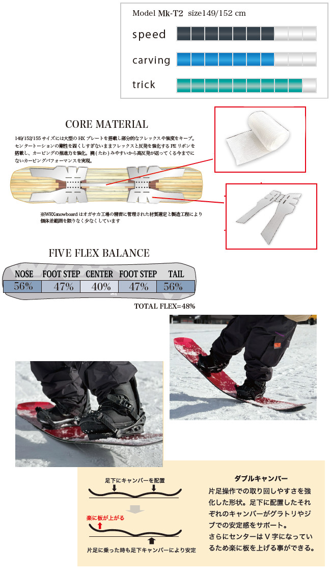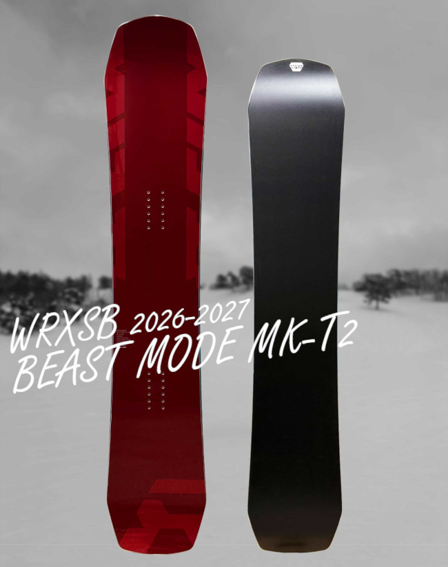 BEAST MODE は、プロですら苦戦する“暴れ馬” シリーズ。 乗りやすさも安定感も、ここにはない。 あるのは、雪面を裂くような反発と、乗り手を試すほどのレスポンス。 それでも手懐けた瞬間、常識を超えたラインが描ける。 扱うんじゃない。解き放て。 これがWRXsb の最狂プロダクトライン、BEAST MODE。 BEAST MODE Mk-T2は、プロですら苦戦する乗り味をコンセプトに開発された限界実験機。 カービング特化型モデル「Mk-U」の思想をベースに、暴れと反発を極限まで引き出すための 再構築を行った。 最大の特徴は、ダブルキャンバー構造とGSC(グリップサポートキャンバー)の融合。 安定と暴走、反発と制御。 そのすべてを高次元で共存させることで、「乗りこなす」という概念を超えた新たなステージを 創出した。 【ダブルキャンバー × GSC】 センターに仕込まれたダブルキャンバーが、わずかな荷重変化をも増幅し、瞬時に反発として 跳ね返す。 一方で、GSC が雪面を“掴む” ように制御を補助し、暴れの中に一瞬の安定を生み出す。 この相反する構造が、暴力的なまでのレスポンスと滑走性能を両立させる。 暴れながら走る。その感覚こそが、BEAST MODE Mk-T2の本質である。 【トリック性能】 ノーズとテールの可動域を極限まで拡張し、プレスやノーリーでの動作を異常なまでに反応させる。 トーションの自由度と軽量スイングバランスが、低回転スピントリックに異常な切れ味を与える。 扱いやすさではなく、乗り手の“感覚精度” を問う設計。 【パウダー性能】 ノーズの浮力を増し、深雪でも沈まず跳ねるような滑走感を実現。 ダブルキャンバーの接雪ポイントとGSC の補正力が連動し、 まるで雪を切り裂くように走る。 滑るというより、暴れる。その制御不能さの中で、唯一の自由が見える。 【総合性能】 BEAST MODE Mk-T2は、万能ではない。 むしろ、ライダーの理性と技術を試すために存在する。 正確性や安定を求める者にとっては牙を剥くが、感覚で雪と対話できる者にとっては、 比類なき興奮をもたらす。 これは、乗りこなすための板ではない。共に暴れるための武器だ。 |