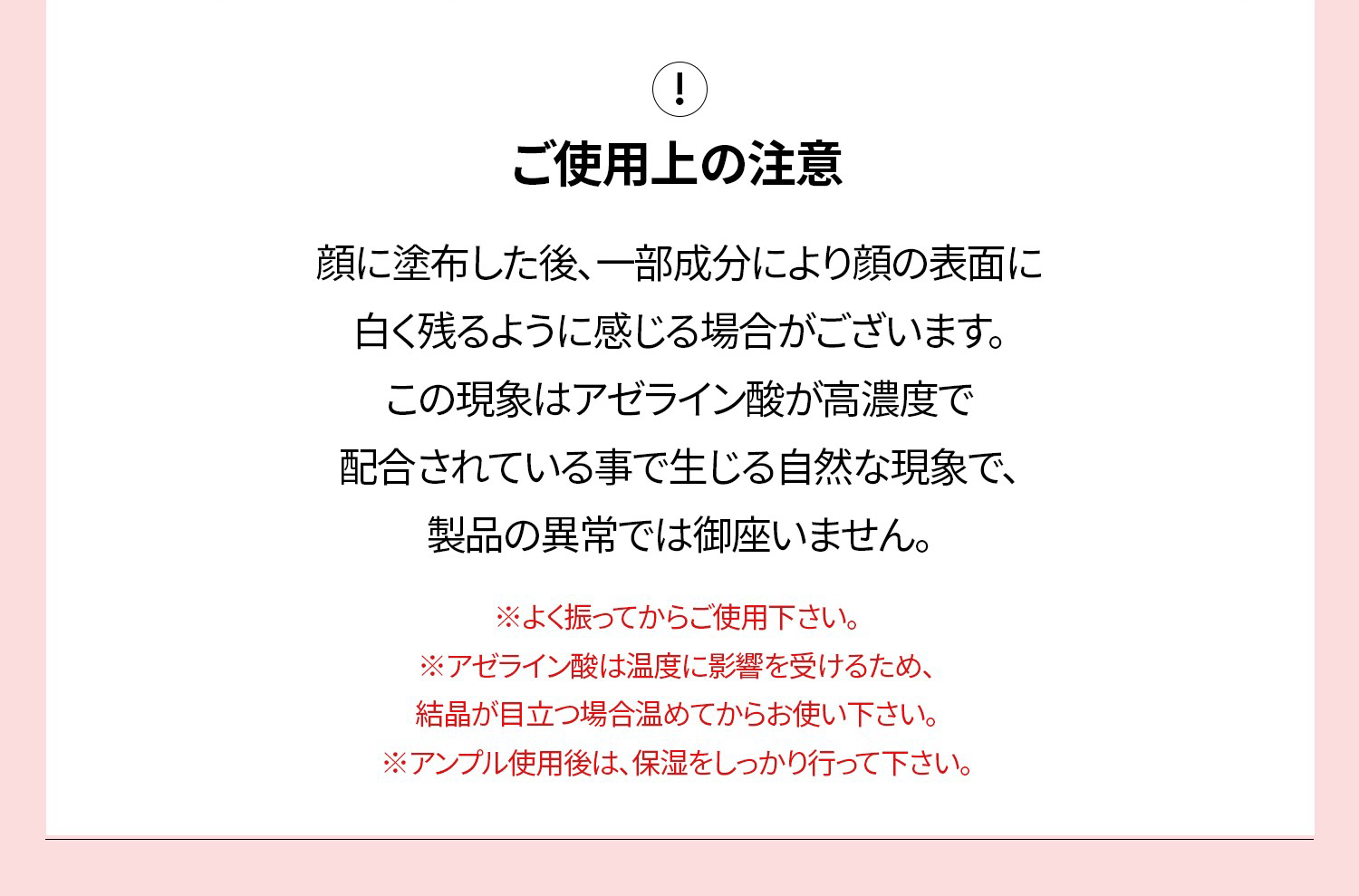 | 使用上の注意 | 1.お肌に異常が生じていないかよく注意して使用してください。化粧品がお肌に合わないとき即ち次のような場合には、使用を中止してください。 そのまま使用を続けますと、症状を悪化させることがありますので、皮膚科専門医等にご相談されることをおすすめします。 (1)使用中、赤味、はれ、かゆみ、刺激、色抜け(白斑等)や黒ずみ等の異常があらわれた場合 (2)使用したお肌に、直射日光があたって上記のような異常があらわれた場合 2.傷やはれもの、しっしん等、異常のある部位にはお使いにならないでください。 3.目に入った時は、直ちに洗い流してください。 4.保管及び取扱い上の注意 (1)開封後はお早めにご使用ください。 (2)乳幼児の手の届かないところに保管してください。 (3)高温又は低温の場所、直射日光のあたる場所には保管しないでください。 ・天然由来成分を配合しておりますので、変色や沈殿が生じる場合がありますが品質には問題ございません。 |