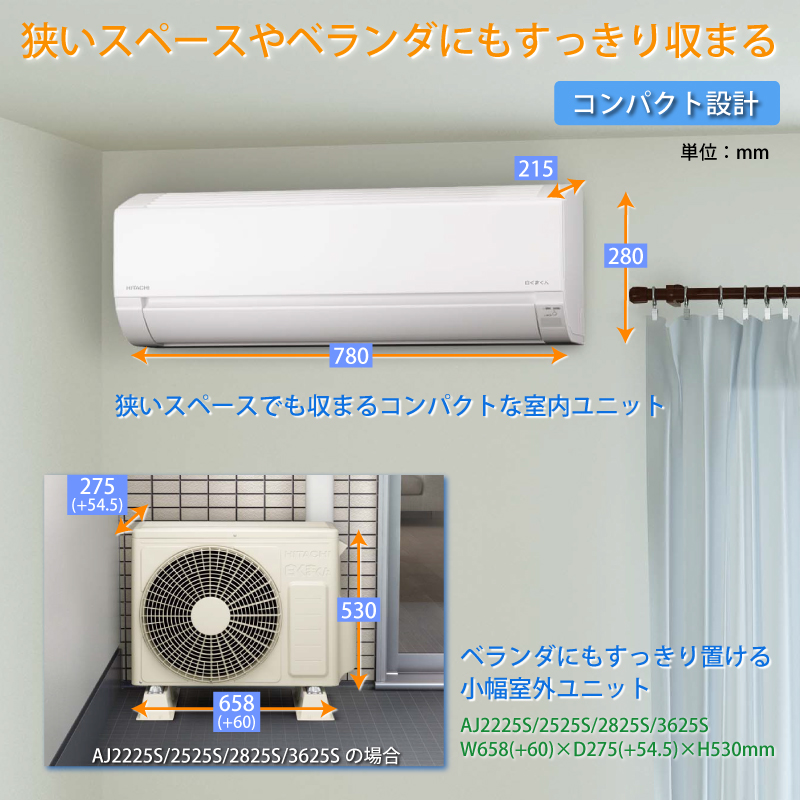 - 狭いスペースでも収まるコンパクトな室内ユニット(AJシリーズ全機種)