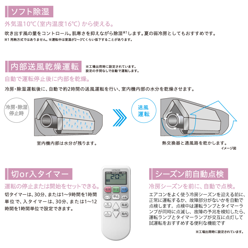 - 外気温10度(室内温度16度)から使えるソフト除湿。肌寒さを抑えながら除湿します。
