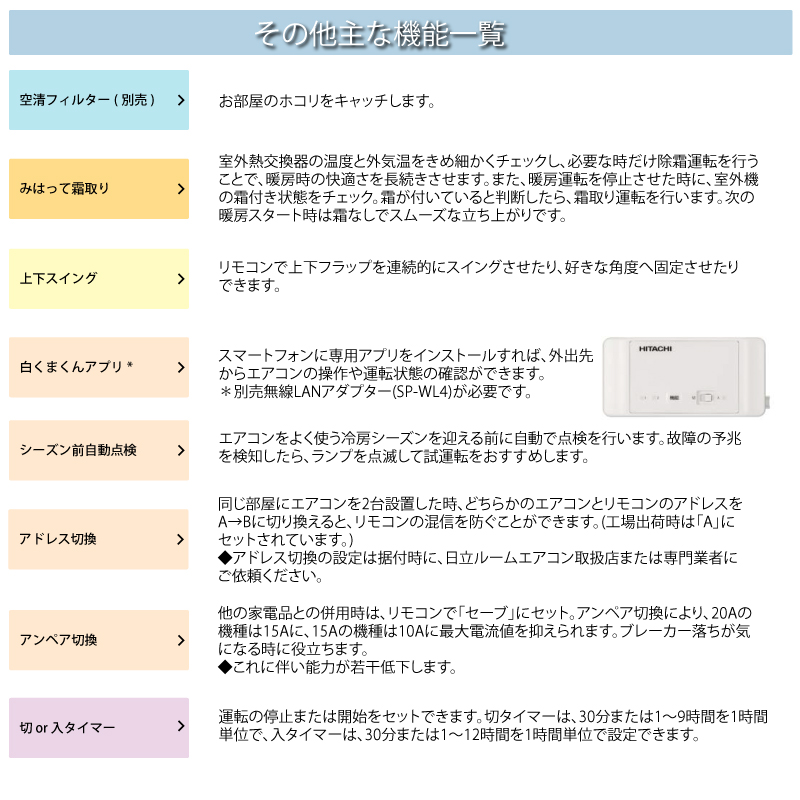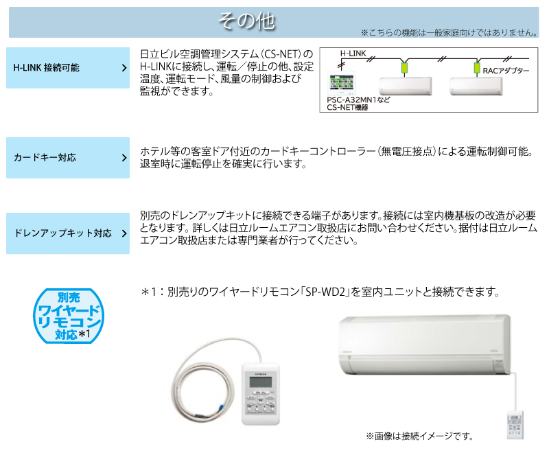 - その他、業務向け「H-LINK/カードキー/ワイヤードリモコン対応など」機能あり。