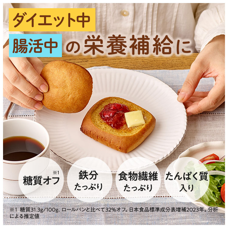 | 栄養成分 | ふわもちロール(1個50g中):エネルギー136kcal、たんぱく質5.6g、脂質4.4g、炭水化物22.0g、糖質15.4g、食物繊維6.6g、食塩相当量0.54g、ビタミンB1 0.16mg |